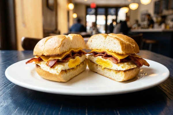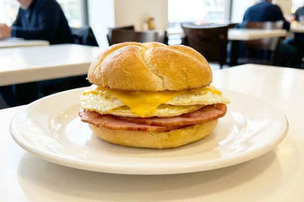 This grilled sandwich is served on a bread roll with bacon and melted cheese.